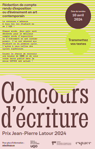 Jean-Pierre Latour a marqué le paysage de la critique d’art au Québec. En plus d’être actif à titre de chargé de cours à l’ÉMI (devenu l’École des Arts et Cultures – ÉdAC en 2023), de 1985 à 2005, Jean-Pierre Latour était, de 2000 à 2005, membre du comité de rédaction de la revue ESPACE sculpture, désormais nommée ESPACE art actuel. Il est l’auteur de Jean-Pierre Latour, critique d’art : voir et comprendre, un ouvrage posthume publié en 2009 par le Centre de diffusion 3D, qui édite la revue. Jean-Pierre Latour aura ainsi marqué le domaine de la critique d’art, des générations d’étudiantes et d’étudiants ainsi que l’histoire d’ESPACE. Cette première association de la revue ESPACE et de l’UQO, pour décerner le Prix Jean-Pierre Latour, sert à revenir sur un passé commun des deux institutions pour mieux encourager la relève de demain.